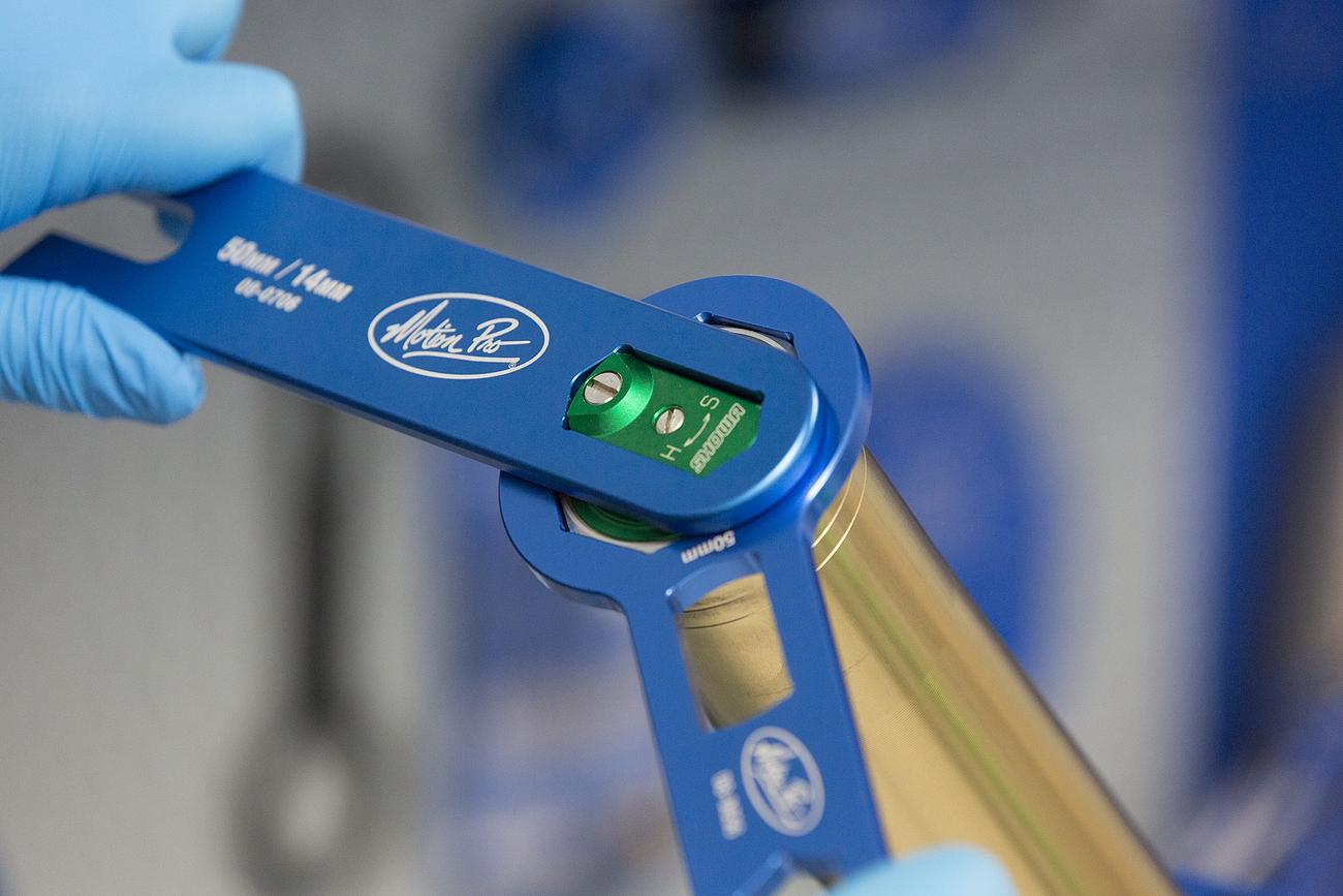 - 14 mm slot for holding the damper rod for removing the rebound bolt. This allows for the removal of the cartridge from the lower fork leg