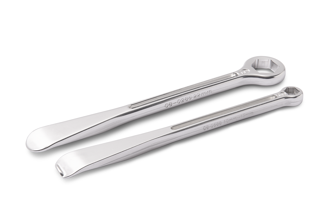 - Second wrench has hex box wrench for 22 mm axle nuts on other end